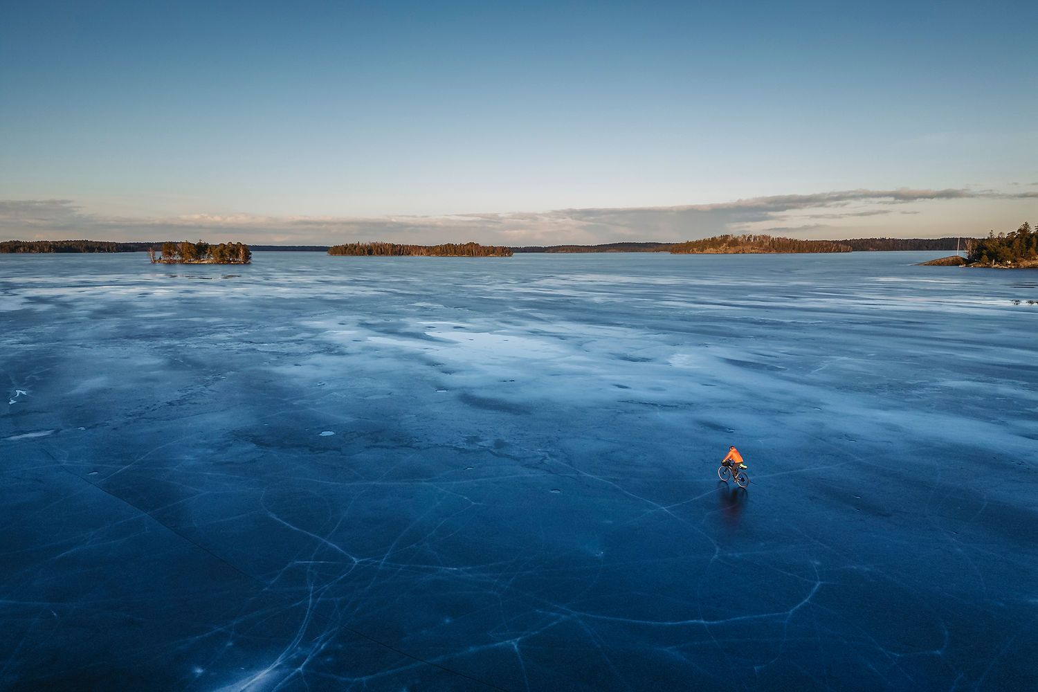 Das Eis unter unseren Reifen verändert ständig seine Farbe. Manchmal ist es so klar, dass man bis auf den Grund sehen kann. Es fühlt sich an, als würde man schweben. Dann wieder ist es milchig trüb mit bizarren Platten aus schwimmendem, gebrochenem Eis. Das Gefühl ist immer dasselbe − unbeschreiblich. Wir fahren mit dem Fahrrad an Orte, die normalerweise nur mit dem Boot zu erreichen sind, und Inseln, die sonst kilometerweit vom Ufer entfernt liegen, ziehen an uns vorbei. Die völlige Stille und die Weite auf allen Seiten sind kaum zu beschreiben.
