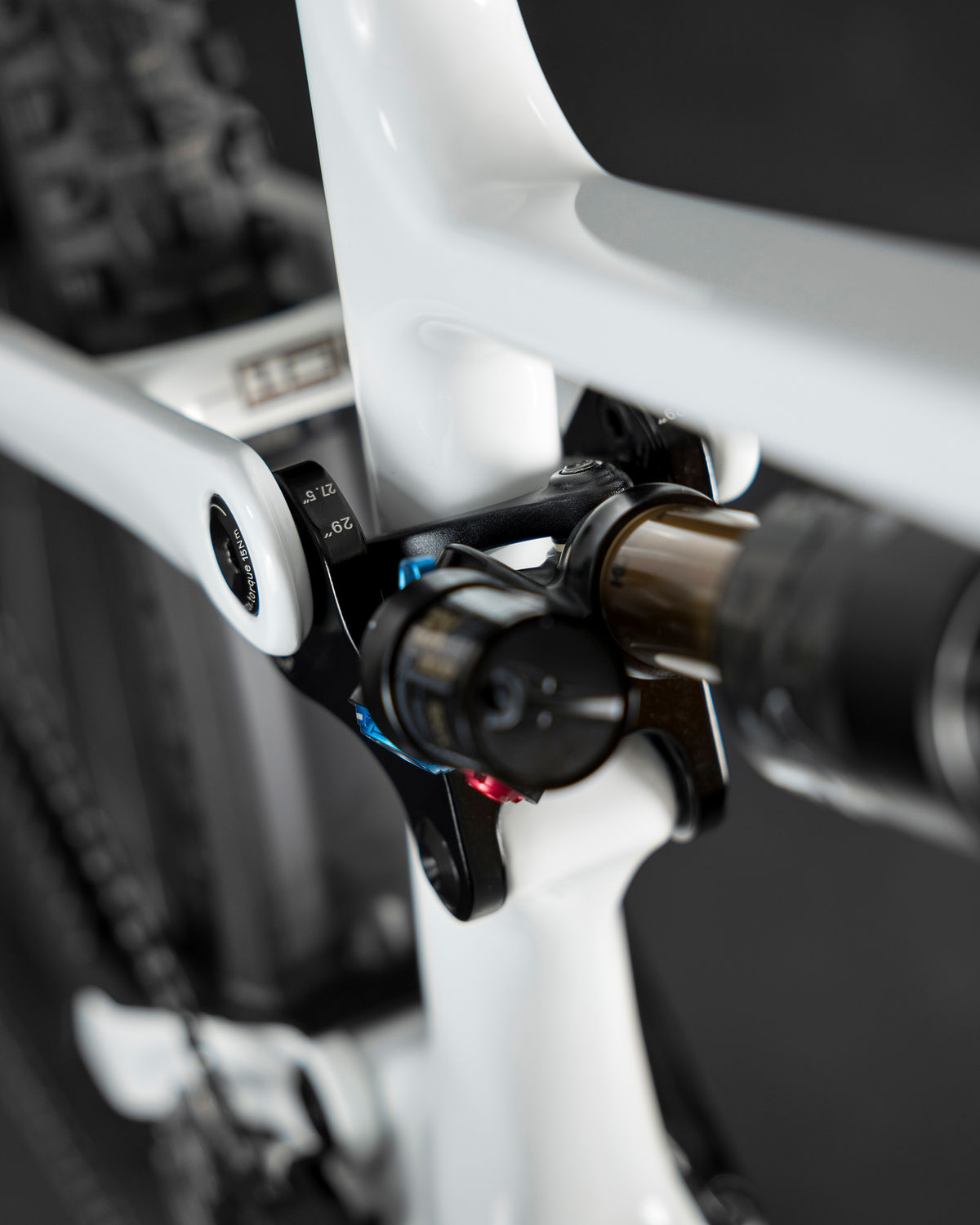 Beide Rahmenmaterialien verfügen über einen FLIP CHIP im Rocker, der es ermöglicht, die Hinterradgröße zu ändern, ohne die Geometrie zu beeinträchtigen. Durch die Verwendung des kleineren 27,5"-Hinterrads wird am Hinterrad 14 mm mehr Federweg generiert als bei einem 29"-Laufrad. Zudem ist das Fahrverhalten etwas spritziger als mit dem größeren, "stabileren" 29"-Laufrad. Um größeren (und im Normalfall auch schwereren) und härteren Fahrerinnen und Fahrern die Reserven und den Support zu geben, den sie benötigen, sowie es leichteren Fahrerinnen und Fahrern zu ermöglichen, den vollen Federweg zu nutzen, haben wir letztlich auch die Progression größenspezifisch gestaltet. Die Progression steigt also mit zunehmender Größe des Rahmens.
