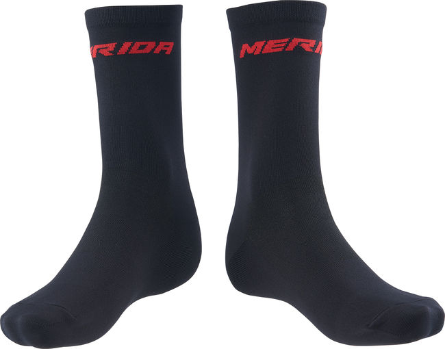 Classic black or white riding socks for road and off-road use. The long 24 - 28 cm (depending on size) socks are super comfortable, lightweight and breathable. The black socks are available in four different logo colours, while the white version is available in classic white with black MERIDA writing.