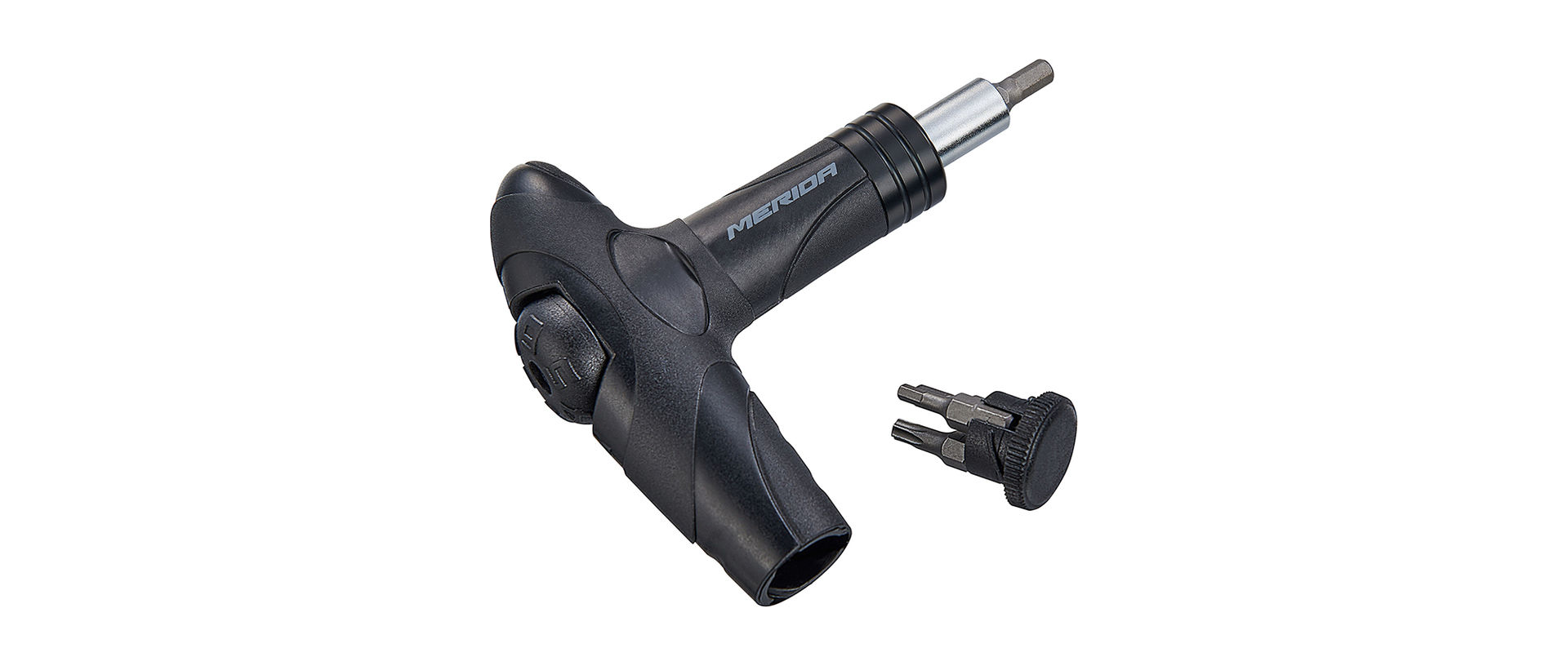 „Mit seinem schnörkellosen T-förmigen Griffdesign ist MERIDAs einstellbarer Drehmomentschlüssel das perfekte Werkzeug zum schnellen und einfachen Anziehen von Schrauben. Er verfügt über drei Drehmomenteinstellungen – 4 Nm, 5 Nm und 6 Nm − und ist mit einem 3 mm, 4 mm und 5 mm Inbusschlüsseln sowie einem T25 Torx-Schlüssel für die meisten gängigen Schrauben an einem Fahrrad geeignet. Bis auf einen Schlüssel werden alle im Inneren des Gehäuses aufbewahrt. Der Preis überzeugt!