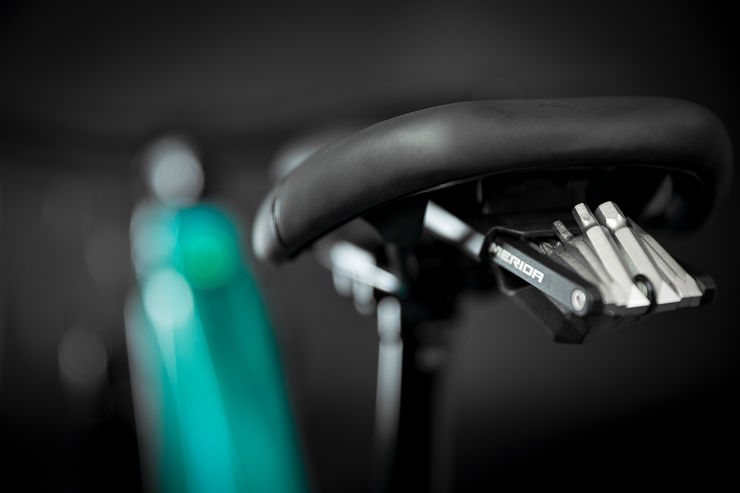 Die MERIDA Mini-Toolbox ist direkt mit der Unterseite des Sattels verbunden. Darin enthalten ist ein Mini-Tool, das über 2/2,5/3/8-mm-Inbusschlüssel, einen Flachkopf- und Kreuzschlitzschraubendreher sowie über 10/25/30-Torxschlüssel verfügt. Perfekt für nahezu jede Reparatur am Wegesrand.