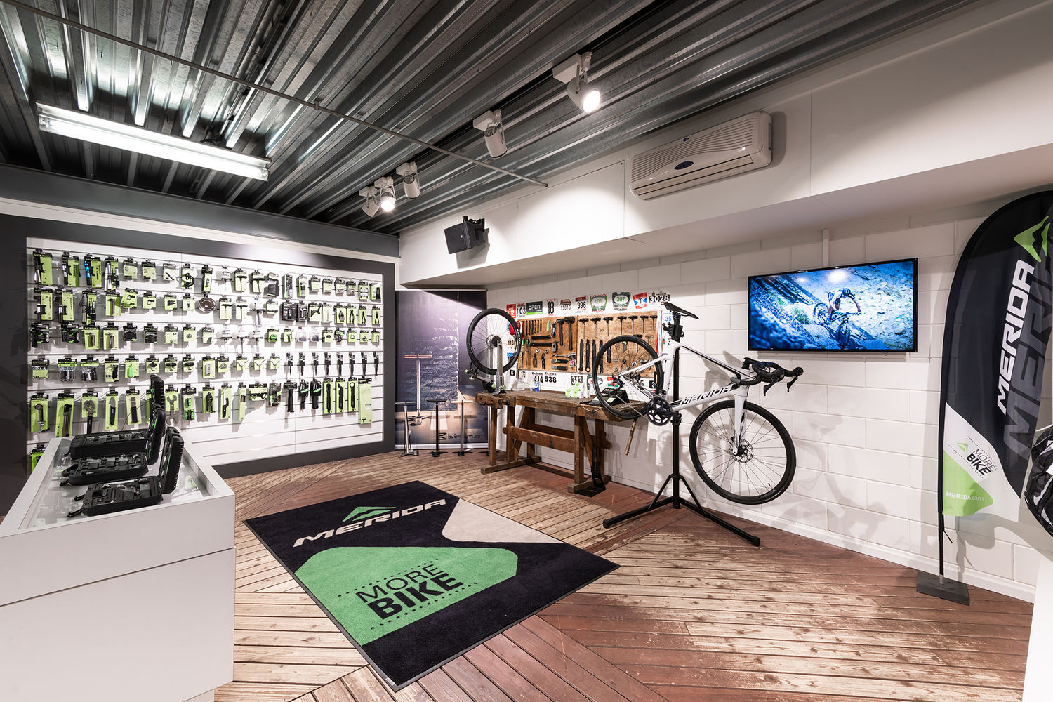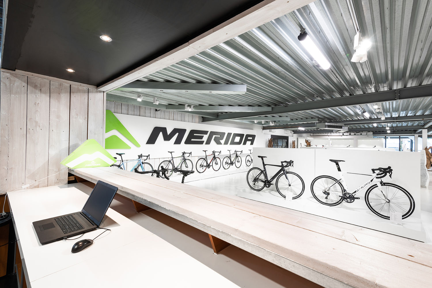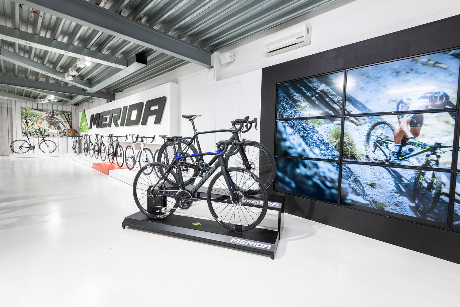 Früher saß hier ein Harley-Davidson-Händler und ich kam ursprünglich hierher, weil ich mich für Motorräder interessierte. Eines Tages bemerkte ich, dass die Motorräder weg waren, und fand heraus, dass das Gebäude zur Vermietung stand. Es ist wirklich cool, da es nicht nur einen großen Ausstellungsraum und viel Lagerfläche hat, sondern auch eine Bar, einen Billardtisch und einen offenen Kamin! 2019 hat MERIDA das Gebäude übernommen, seitdem sind wir hier. Es heißt MERIDA EXPERIENCE CENTER, weil wir möchten, dass die Kunden nicht nur kommen, um sich Fahrräder anzusehen, sondern sie wirklich erleben. Das ist uns sehr wichtig. Vor allem, wenn sie eine große finanzielle Investition in ein Fahrrad tätigen, müssen sie wissen, wie es sich anfühlt. Zudem möchten wir, dass die Händler hierherkommen und das ganze Portfolio sehen können, das MERIDA zu bieten hat.
