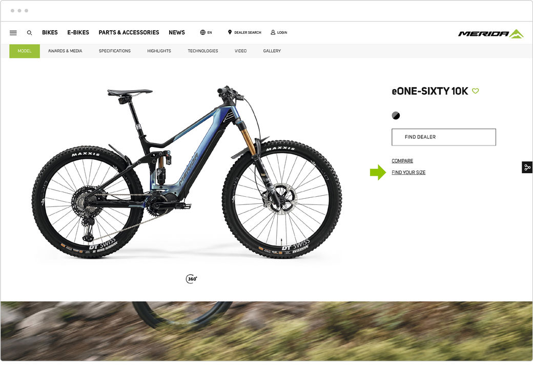 Sie finden das Tool auf jeder Fahrradseite, indem Sie auf den Link FINDEN SIE IHRE PASSENDE RAHMENGRÖSSE klicken, wie auf der rechten Seite gezeigt.