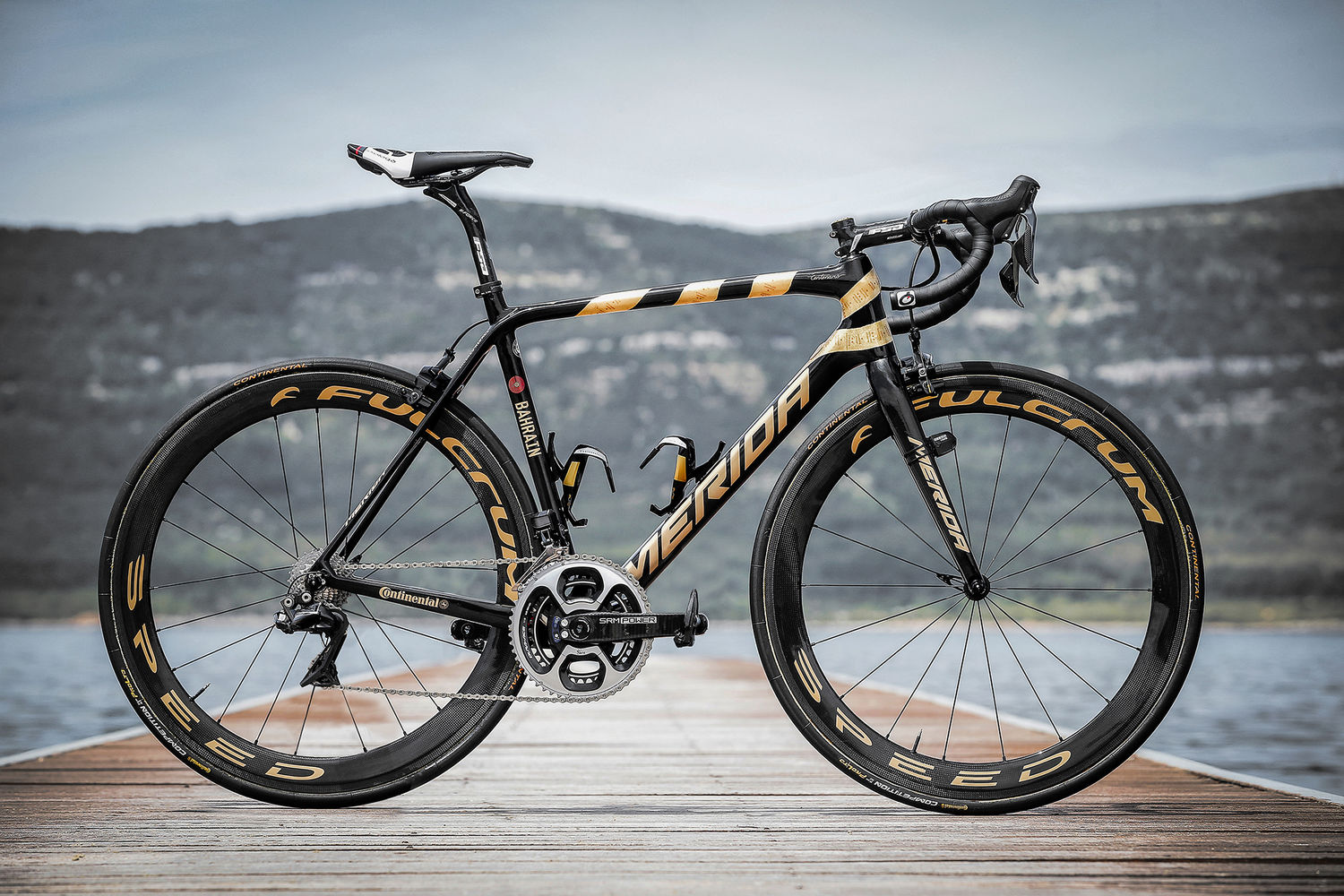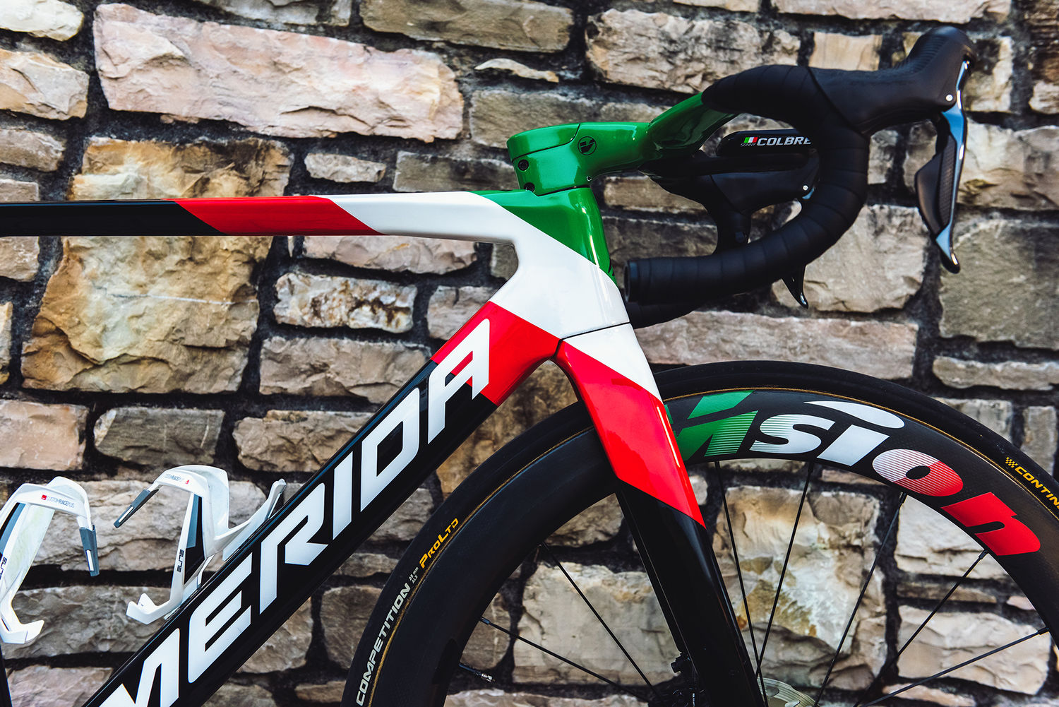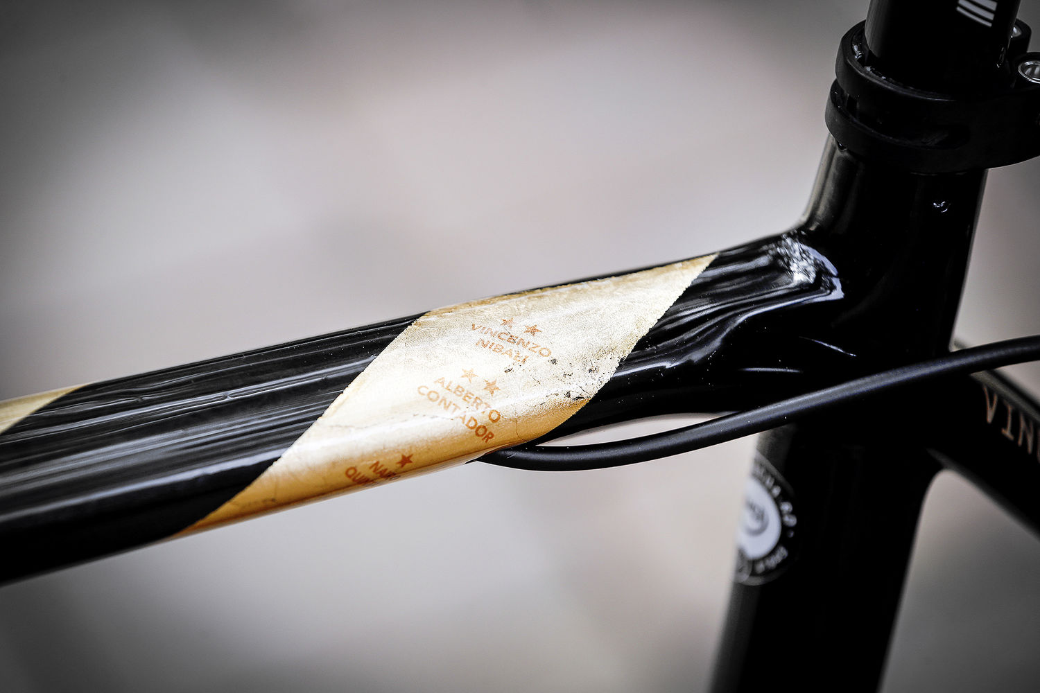 One of the first and most widely documented 'one of a kind' paint jobs we have created was former BAHRAIN MERIDA’s team captain Vincenzo Nibali’s black and gold SCULTURA. The bike was created to be the two times champion’s bike for the 100th edition of the Giro d’Italia in 2017. Taking inspiration from the famous spiral-shaped trophy of the Giro, the super light carbon frame featured a black and golden paint job that mirrored the shape of the event’s trophy and used real gold leaf rather than paint to create this unique look. As an additional special feature, every winner of the Giro d’Italia was mentioned by name on the gold spiral of the bike; most importantly, the rider of this 'one of a kind' SCULTURA used during the centennial edition of this famous Italian road race.
