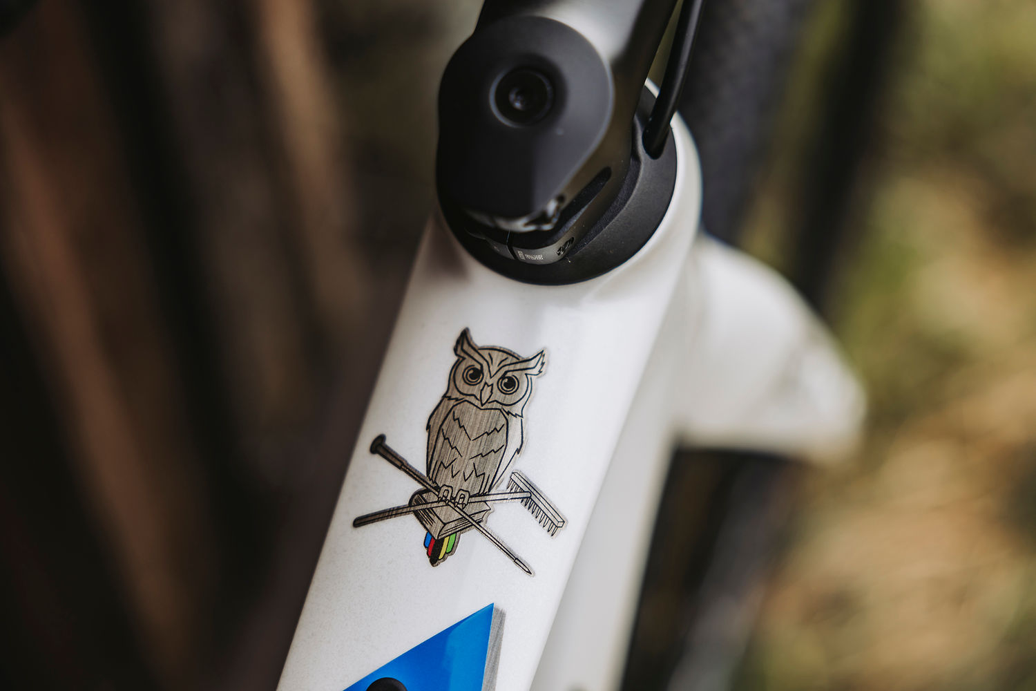 Other notable design elements include Matej's "MOHO" nickname signature emblazoned on the fork leg and an owl motif adorning the top tube. The owl, along with its associated symbols, holds deep personal significance for Matej, representing studiousness, wisdom, and science—values close to his heart. Additionally, the rake emblem pays homage to Matej's rural upbringing, while the elegant walking cane reflects his passion for fashion and style.
