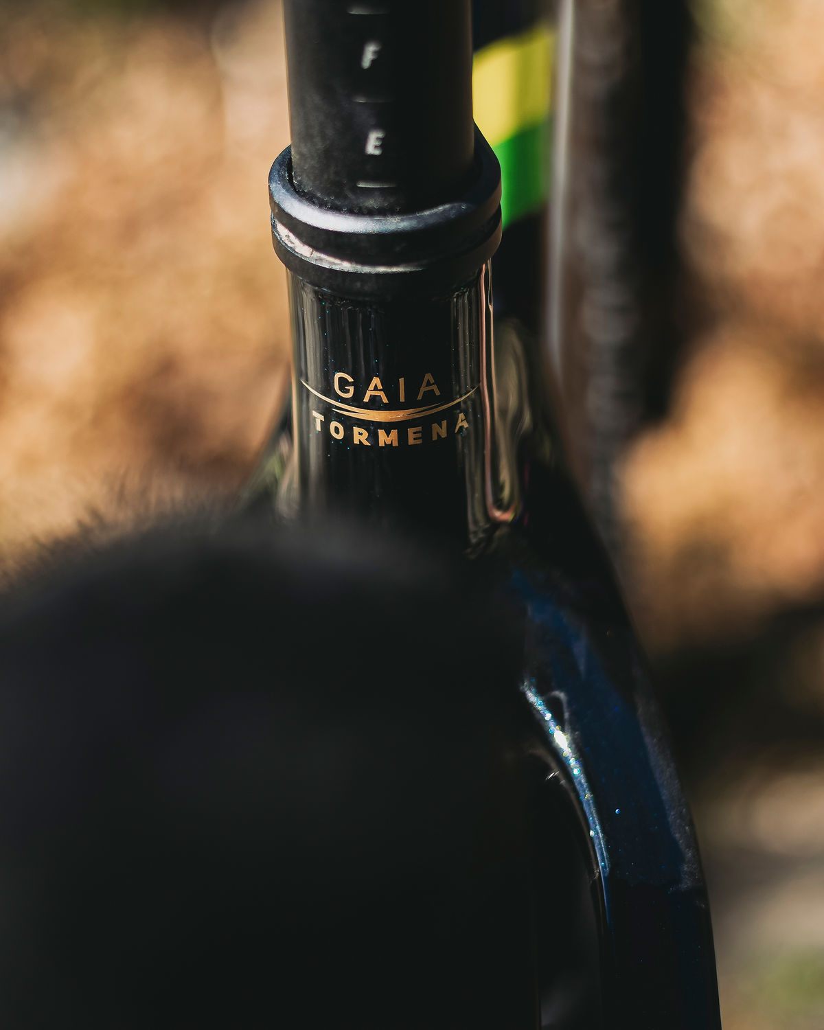 To honor her achievements, we've designed a unique carbon Big Nine for the 2024 season. Featuring a lightning-inspired design in World Championship colors, it symbolizes Gaia's power and acceleration. The frame bears the word "FORZA" for added motivation, and gold accents celebrate her golden season. A subtle 'Tormena Tornado' graphic pays homage to her ability to dominate the field.
