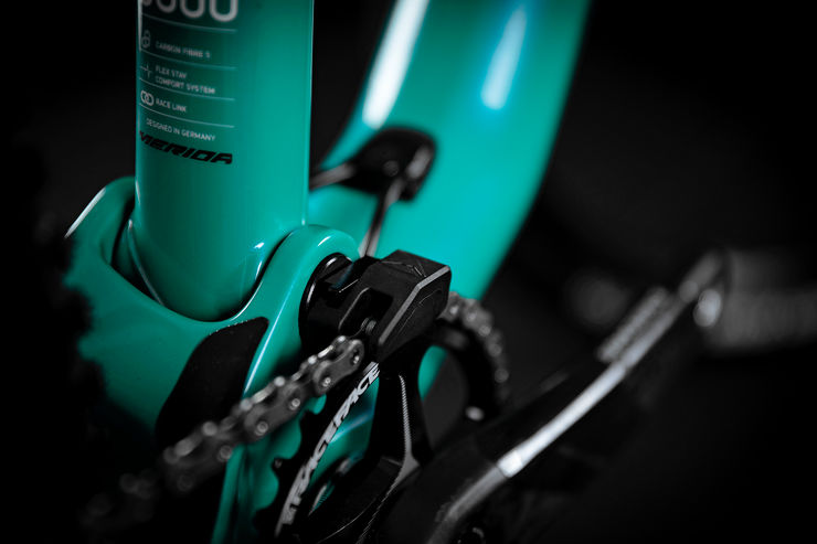 Today’s demanding course push man and machine to its limits. To reduce the risk of chain drop, we have developed a Merida chain guide. It is extremely light and small in appearance while making sure that the chain stays perfectly in place. It is adjustable to various chainring sizes and maintains its minimalistic appearance whatever the chosen chainring size.