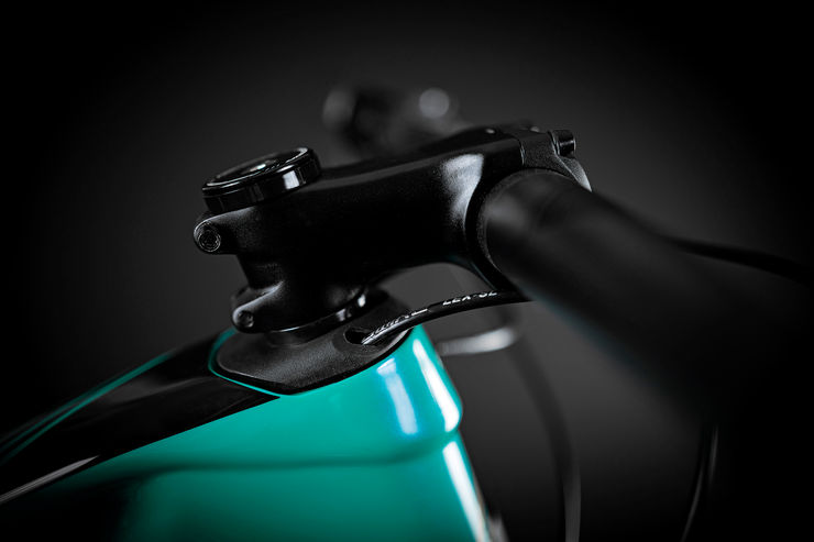 All control cables like gear, brake and dropper post cable enter the frame through a specifically shaped headset cap, cleaning up the cockpit area while also keeping them out of harm’s way. Only the internally routed cable for the rear shock lockout enters the frame directly into the top tube for extra smooth lockout action.