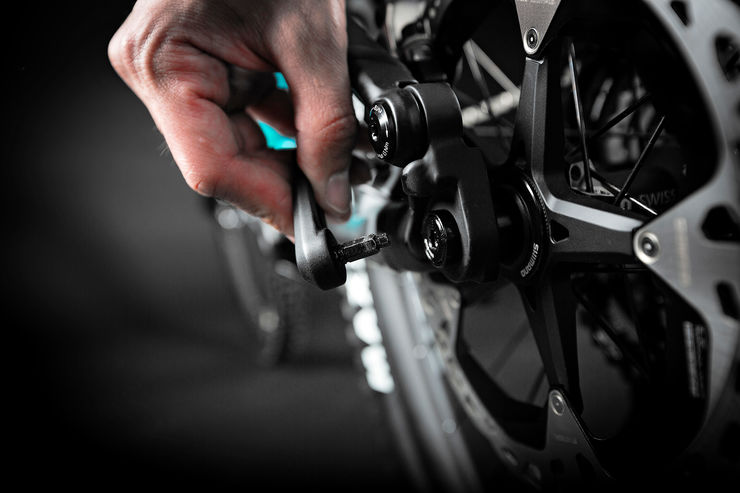 Through axle with removable axle lever. The leaver (when inserted into the axle) allows easy loosening and tightening of the axle. When removed, it works as a 4 mm Alley key, perfect for tightening, for example, the seat clamp or the stem bolt, while also ideal for removing the battery or activating the 'wake up button'.