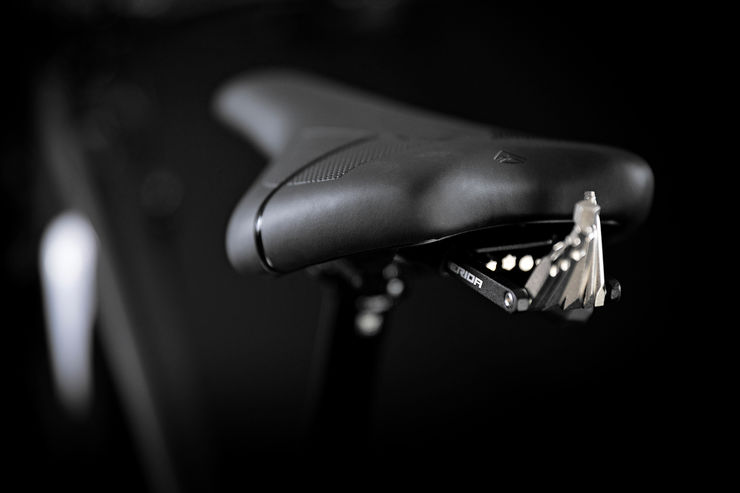Connected to the saddle's faceplate is the new MERIDA mini toolbox. The included mini tool features 2/2.5/3/8 mm Allen keys, a flathead and Phillips head screwdriver and 10/25/30 Torx keys. Perfect for fixing most issues trailside.