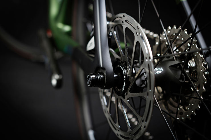 The MISSION ROAD frames feature 12mm bolt through axle front and rear to provide extra frame stiffness. It's also very handy for realigning discs when reinstalling a wheel.