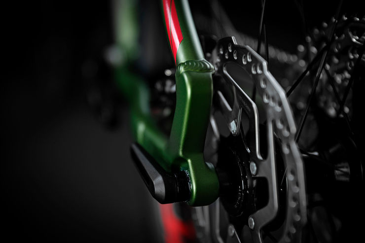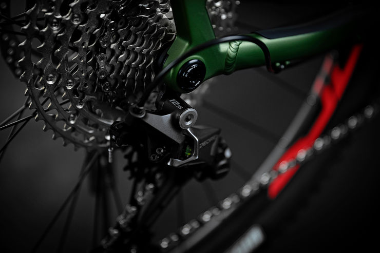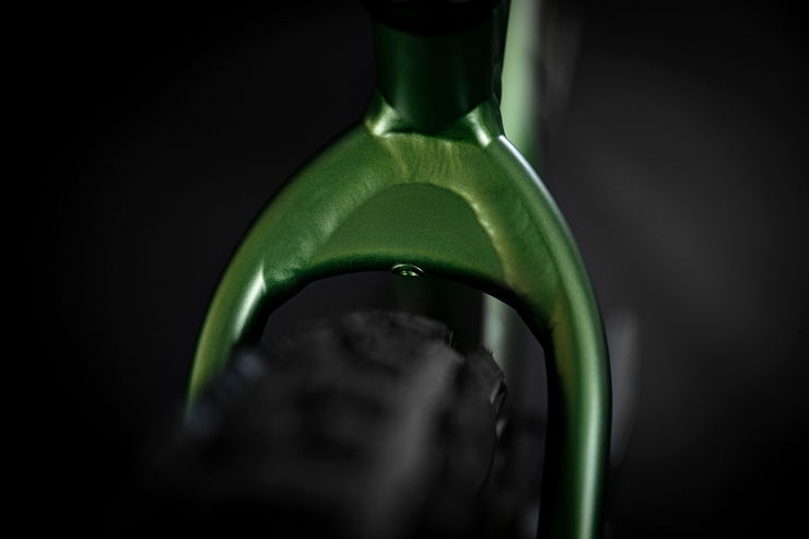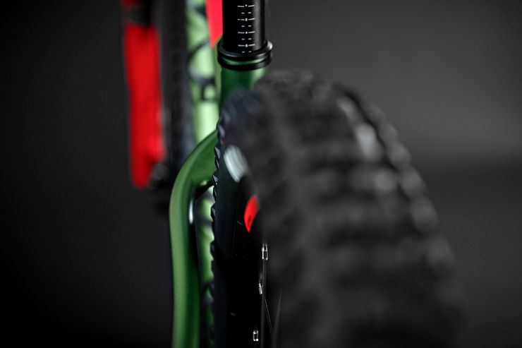 For the BIG.TRAIL it is also important that 29er wheels, specced with trail-ready 2.5“ wide tyres fit into the frame. With a hardtail, the tyre choice is even more important, and it has a big influence on the trail performance. The bike is designed around a 55 mm chain line which allows for ample tyre clearance. This is important so that even during extreme manoeuvres or in super muddy trail conditions, the tyre doesn’t touch the chain or seat stays. The further advantage about using a 55 mm chain line is that it doesn’t require the need for a new wheelset, for example, a 'super-boost' wheelset. The fitted crank offers more off-set and allows for conventional boost wheelsets to be fitted into the BIG.TRAIL.