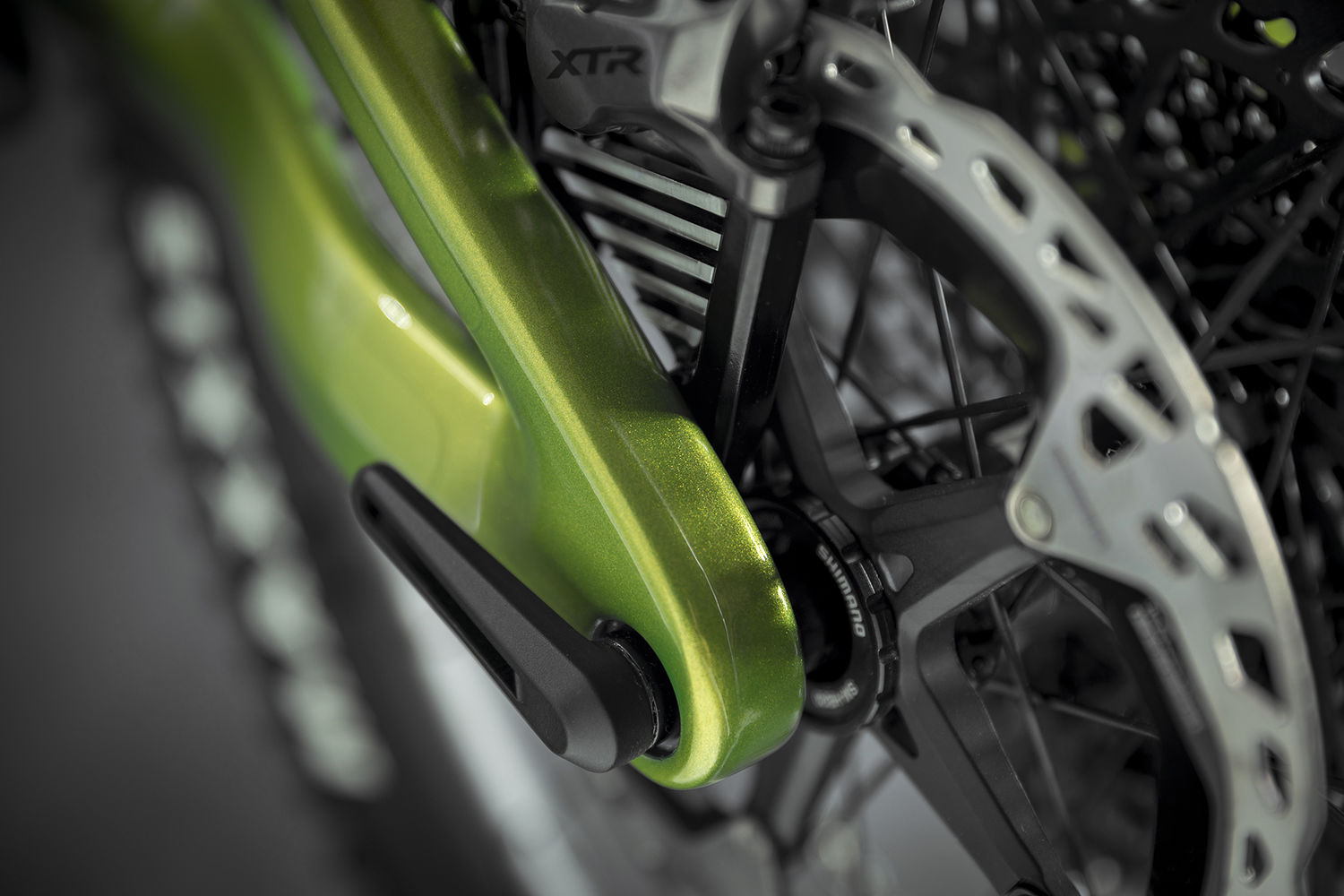 Premièrement, l'étrier de frein repose certes sur le hauban mais il est toujours lié à la base. Comme il n'est pas écrasé entre la chaîne et le hauban, tous les étriers de frein disponibles peuvent être montés, toutes tailles confondues. Alors que l'ancienne conception protégeait l'étrier des chocs potentiels, la restriction d'espace limitait également le montage des étriers, rendant parfois le réglage délicat.