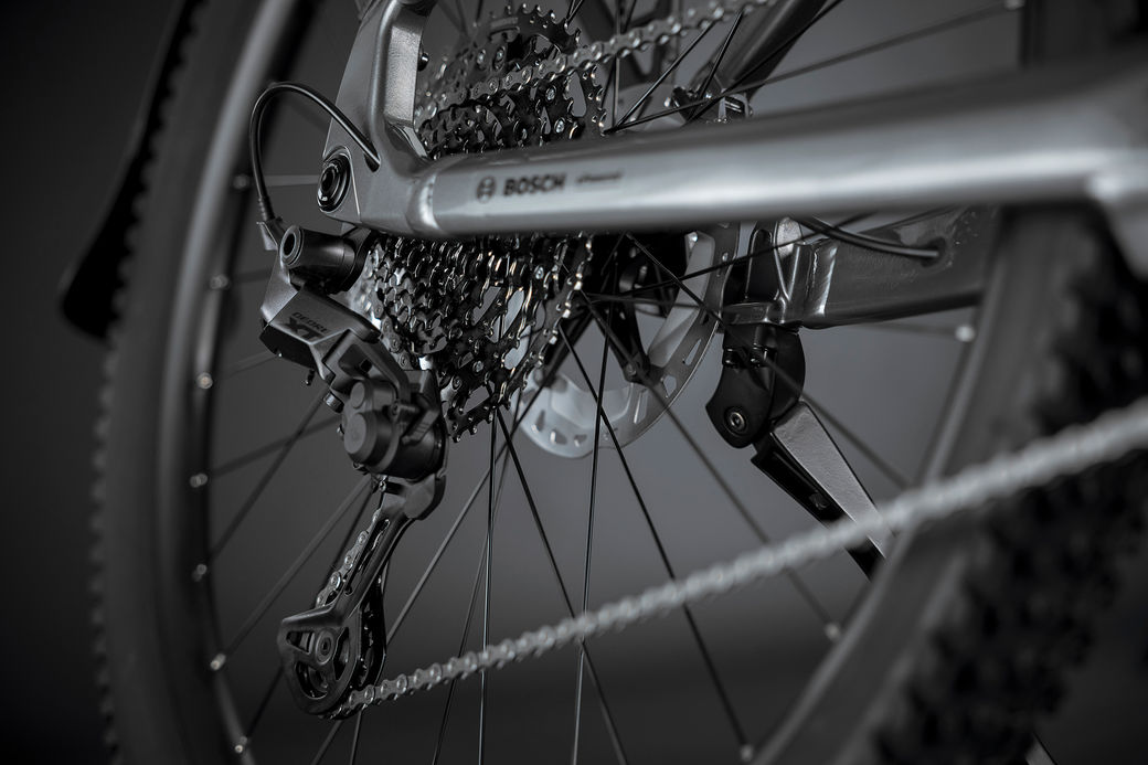 Chaque modèle de la gamme eFLOAT utilise la nouvelle unité d'entraînement Performance Line CX. Ce moteur d'assistance au pédalage haut de gamme offre un soutien puissant et silencieux, avec 85 Nm de couple pour gravir les collines, ce qui en fait l'une des options les plus puissantes disponibles. Avec des révisions internes pour le rendre plus silencieux et réduire la résistance au pédalage, il offre des performances incroyables, avec une stabilité thermique de pointe qui permet de délivrer des performances maximales, même sous des charges extrêmes. Chaque modèle offre de nombreuses options de batteries, avec des options amovibles pour l'utilisateur de 800 et 600 Wh disponibles selon les modèles. Le système de rail Bosch permet également de passer à l'une ou l'autre capacité de batterie principale sans avoir besoin de pièces de montage supplémentaires, ce qui facilite les mises à niveau. Toutes les tailles de vélo, qu'elles soient conventionnelles ou à cadre bas, peuvent accueillir le prolongateur d'autonomie Bosch PowerMore de 250 Wh en option. Pesant seulement 1,6 kg et ayant à peu près la taille d'une bouteille d'eau, c'est un moyen parfait d'augmenter l'autonomie de votre eFLOAT.