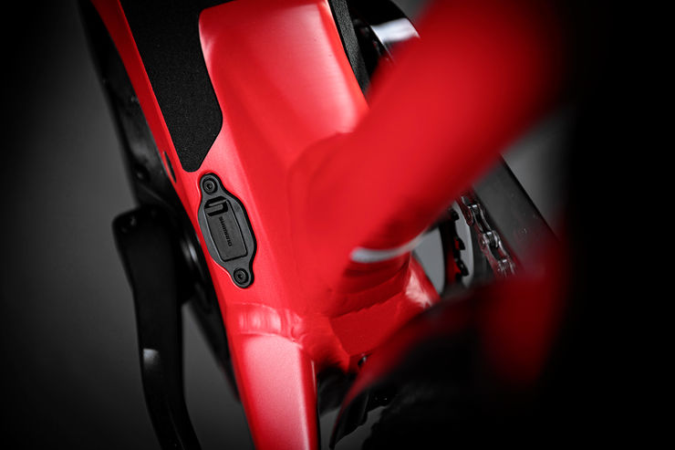 La batterie est insérée dans le support ENERGY CRADLE et partiellement intégrée dans le cadre. Au lieu d'entamer la stabilité et la maniabilité du vélo en découpant le tube diagonal - un point faible pour les cadres à entrée basse - nous avons fixé le support de batterie ENERGY CRADLE sur le tube diagonal. Ce capuchon, à l'instar d'un coffre, peut être facilement ouvert en tournant le verrou vers le haut et en repliant le cache vers le tube de selle. Le pilote a ainsi les deux mains libres pour s'emparer facilement de la batterie, sans devoir se tordre ou se baisser.
