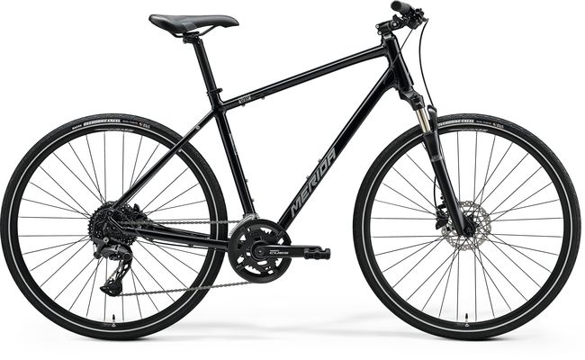 The CROSSWAY family has been the MERIDA range's backbone since its introduction. They are used worldwide and are proven as a reliable, versatile and fun-packed way of getting around. Designed to provide a comfortable place to take in the surroundings thanks to an upright riding position and comfort focused equipment such as suspension fork, suspension seat posts and adjustable stems, they offer the perfect blend of comfort, enjoyment and all-round functionality. They are suitable for fitness training, commuting and leisurely rides through forests and on trails. Made from high-quality, lightweight aluminium with the ability to mount mudguards, racks and kickstands, the CROSSWAY range is the perfect choice for everyday riding. The fitted 700c wheels cover ground quickly, while the extra volume of the 40 mm wide tyres offers puncture protection, grip and comfort. All CROSSWAY models are available as a low step-through frame, making mounting and dismounting straightforward.