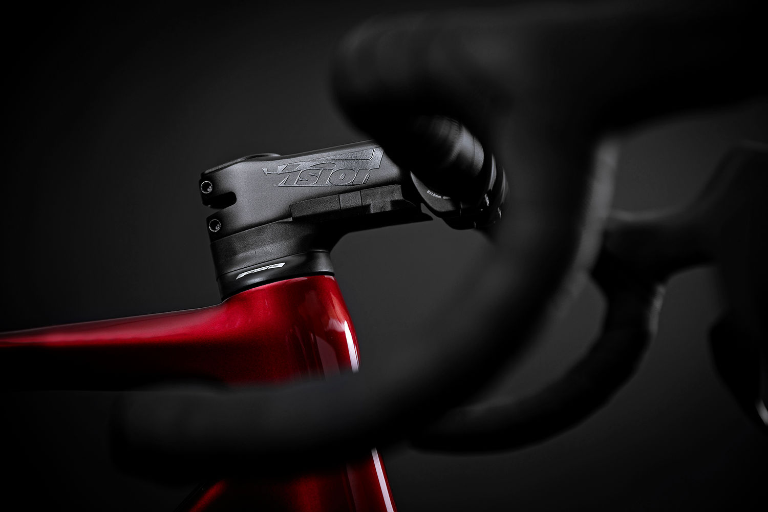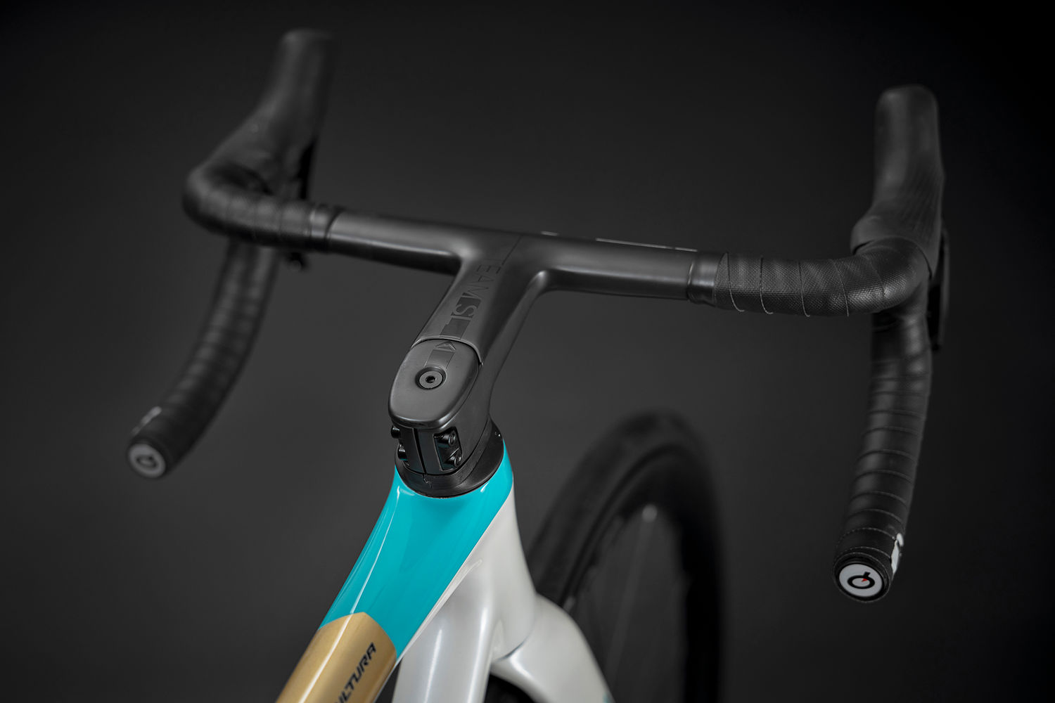 The full carbon one-piece handlebar-stem combination that is exclusively fitted to the SCULTURA 10K, TEAM and 9000 offers outstanding aerodynamics and weight savings (320 g) while giving the rider plenty of control. All cables run through internal lines in the cockpit for a sleek, uncluttered look that reduces drag. It also features our self-designed Garmin mount holder which offers two positions, is completely removable and can also be used as a GoPro mount.
