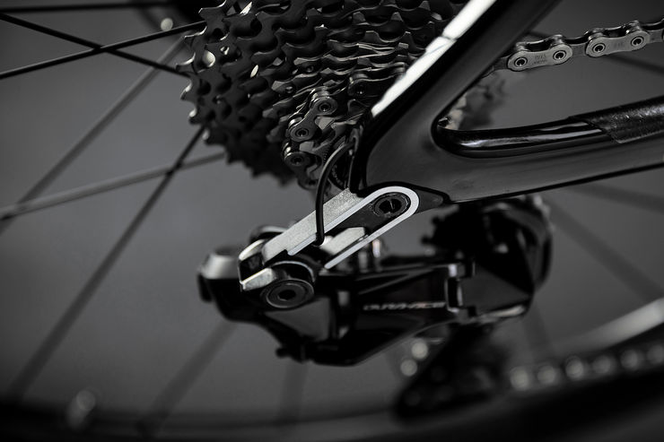 The direct mount gear hanger fitted to the SCULTURA CF5 and CF3 framed models reduces moving parts at the derailleur end and improves shifting accuracy as well as aiding fast wheel changes.