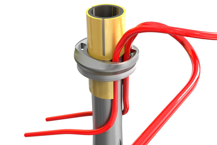 The FORCE DIFFUSER is an integral part of the MERIDA TEAM SL 1P COCKPIT and drastically improves the fork steerer tube fatigue life. The metal sleeve of the FORCE DIFFUSER wraps around the carbon steerer in the clamping area and evenly spreads the load generated by the clamping process.