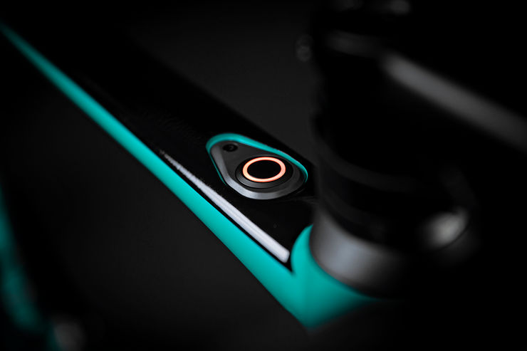 To keep the cockpit as clean as possible, we have placed the iWOC on/off switch on the top tube. This location makes it perfect for reaching it in every riding condition. MAHLE's iWOC switch is not just an on/off switch but the rider can also toggle between the different support level by pressing the button. Different colours of the ring indicate at which level the system is running.