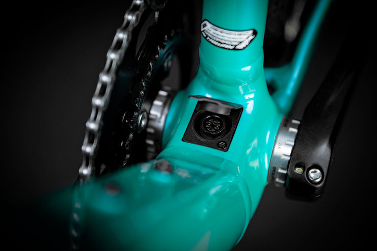 To easily charge the internal battery of the eSILEX, we have positioned the charging port at the down tube/seat tube junction, just above the bottom bracket. This position is perfectly protected and easily accessible.