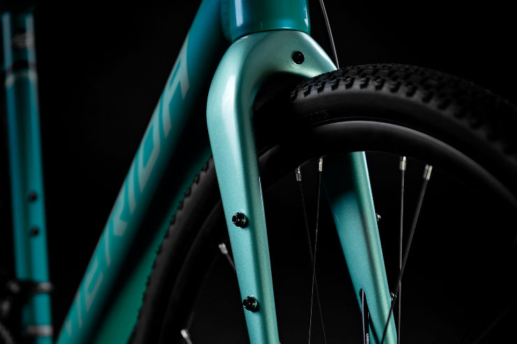 Nasz eSilex ma w pełni karbonowy widelec dla precyzyjnej i komfortowej jazdy. Jest on wyposażony w punkty mocowania, które mogą się przydać na wyprawie. W pełni karbonowa stożkowa rura sterowa pomaga obniżyć wagę roweru i zwiększa precyzję prowadzenia.