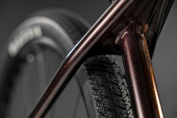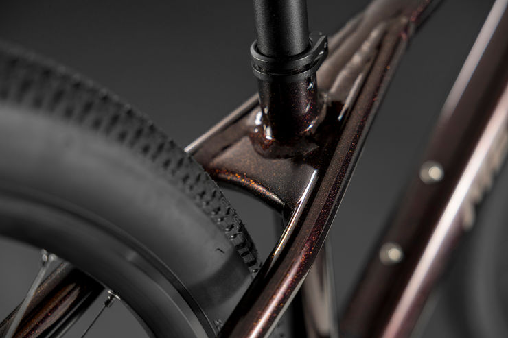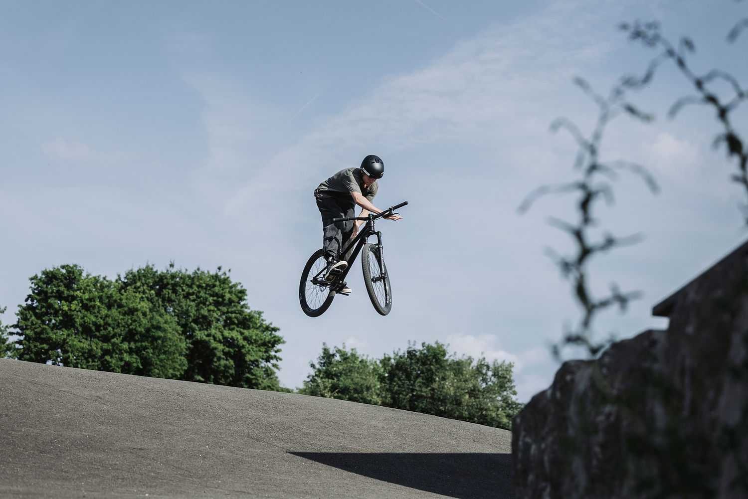 We’ve kept away from any strange standards either – the rear wheel has the classic 135x10 mm axle spacing and we use a normal BSA bottom bracket with dirt jump ready two-piece cranks. We’ve also gone for a ZS44/ZS56 headset, which allows the use of standard gyros for anyone that wants to throw endless barspins. We’ve also made sure there’s a bottle cage mount on the frame, something often overlooked but essential if you want to take a drink or a lock with you.