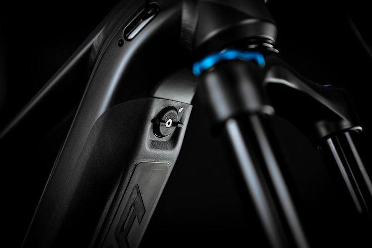 在電池保護蓋的上端,美利達設計了免工具、操作迅速的特殊旋鈕開關,方便快速裝卸整合於下管內的電池。電池蓋的設計,避免了噪音的產生以及碎石撞擊電池的機會。